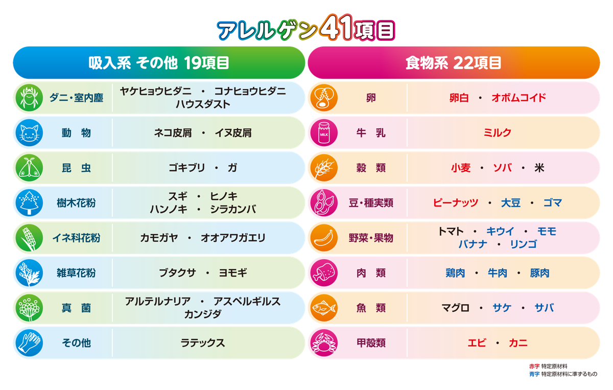 A3:ドロップスクリーン検査では、41種類のアレルゲンを調べることができます。これらのアレルゲンは、アレルギー性鼻炎やアトピー性皮膚炎、喘息、食物アレルギーなどの原因となることが多いものです。詳しくは↑上の表でご確認ください。